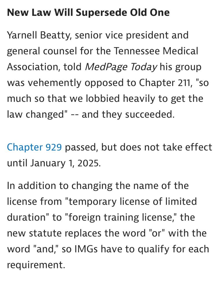 Yeni yasa, 1 Temmuz 2024 tarihinde yürürlüğe girdi. Bu tarihten itibaren ABD dışındaki uzmanlık eğitimini tamamlamış olan uluslararası tıp mezunları, Tennessee’de lisans alarak çalışabilecekler, yasayla ilgili ulaşabildiğimiz detayları aşağıda derledik.