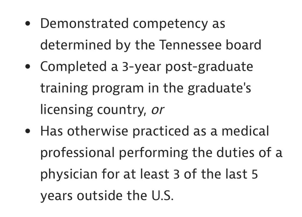 ABD dışında uzmanlık eğitimi aldıysanız ve Tennessee’de doktor olarak çalışmak istiyorsanız, aşağıdaki şartları karşılamanız gerekir: