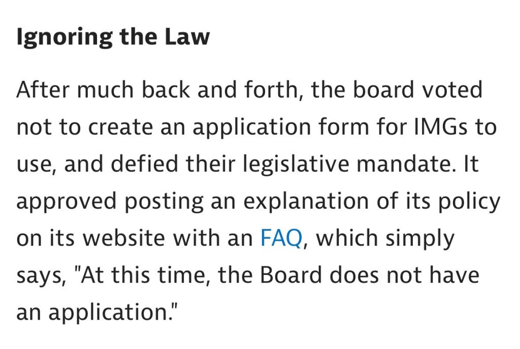 Güncelleme: Kurul, 2025’te yürürlüğe girecek olan, uluslararası tıp mezunlarına (IMG) yönelik daha kısıtlayıcı yeni bir yasa için bekliyor gibi görünüyor. Bu yasa, başvuru sahiplerinin yurt dışında 3 yıl uzmanlık eğitimi tamamlamalarını VE en az 3 yıllık mesleki deneyime sahip olmalarını gerektirecek.